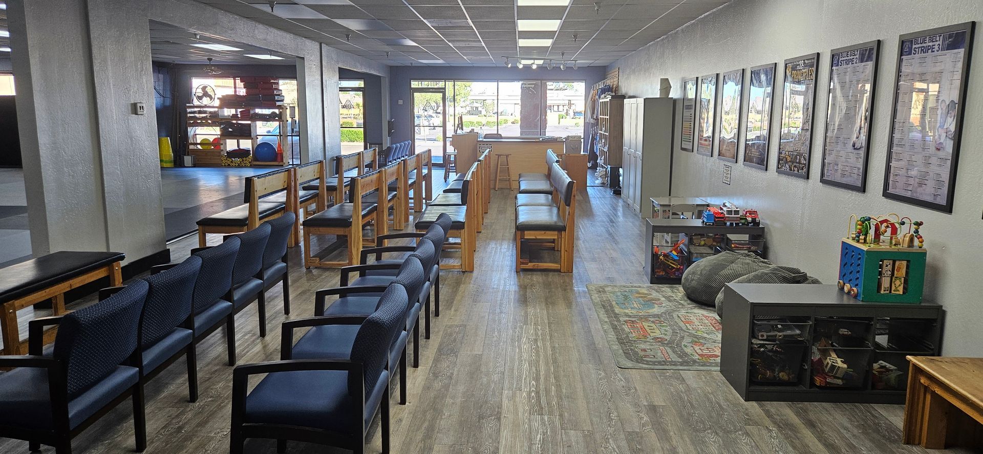 Our front lobby and viewing area offer ample spectator seating, making it easy for parents, family members, and guests to watch classes in a clean, welcoming environment. We also provide a dedicated sibling play area, so families with multiple children can relax knowing everyone has a place to be.